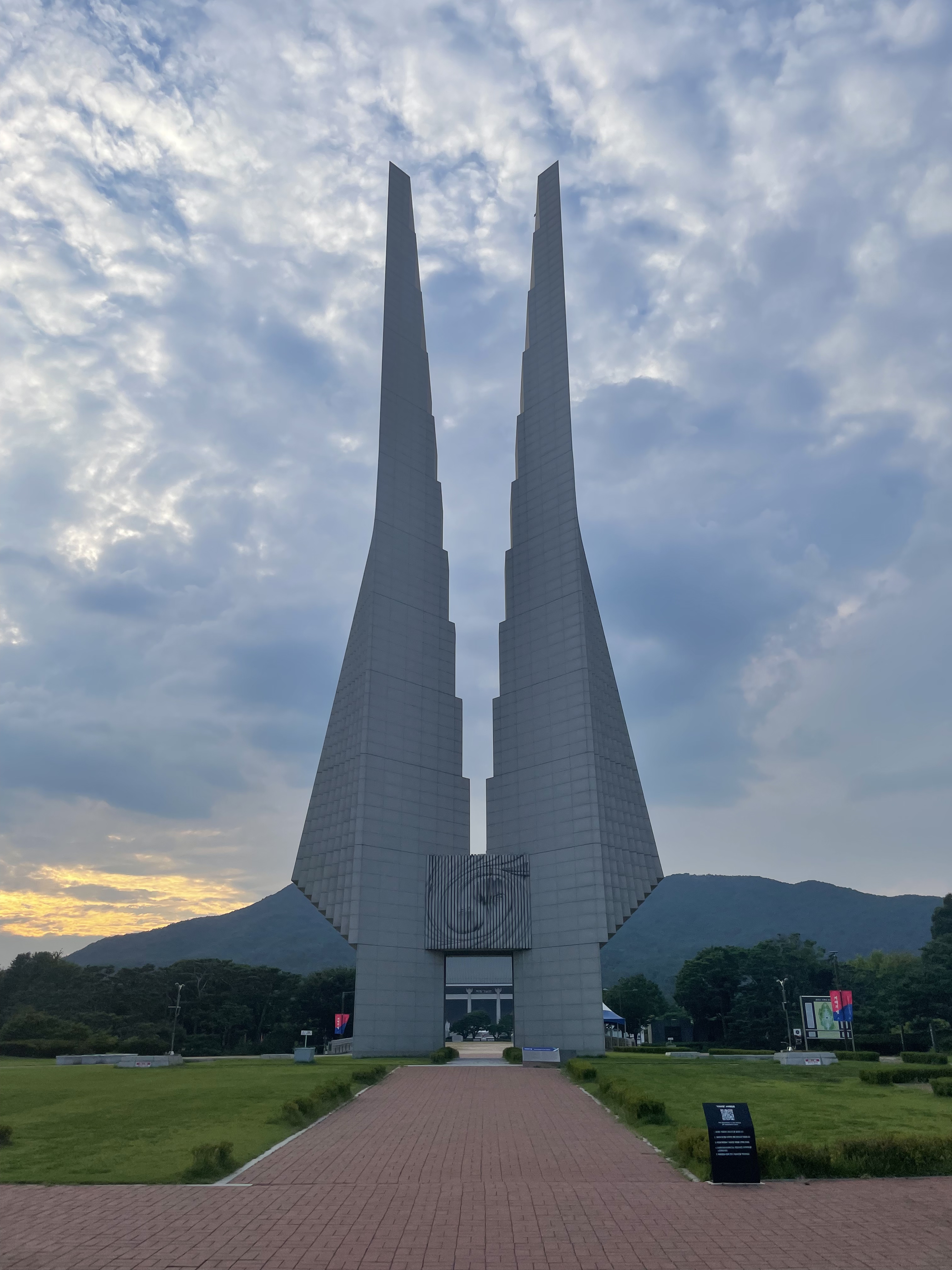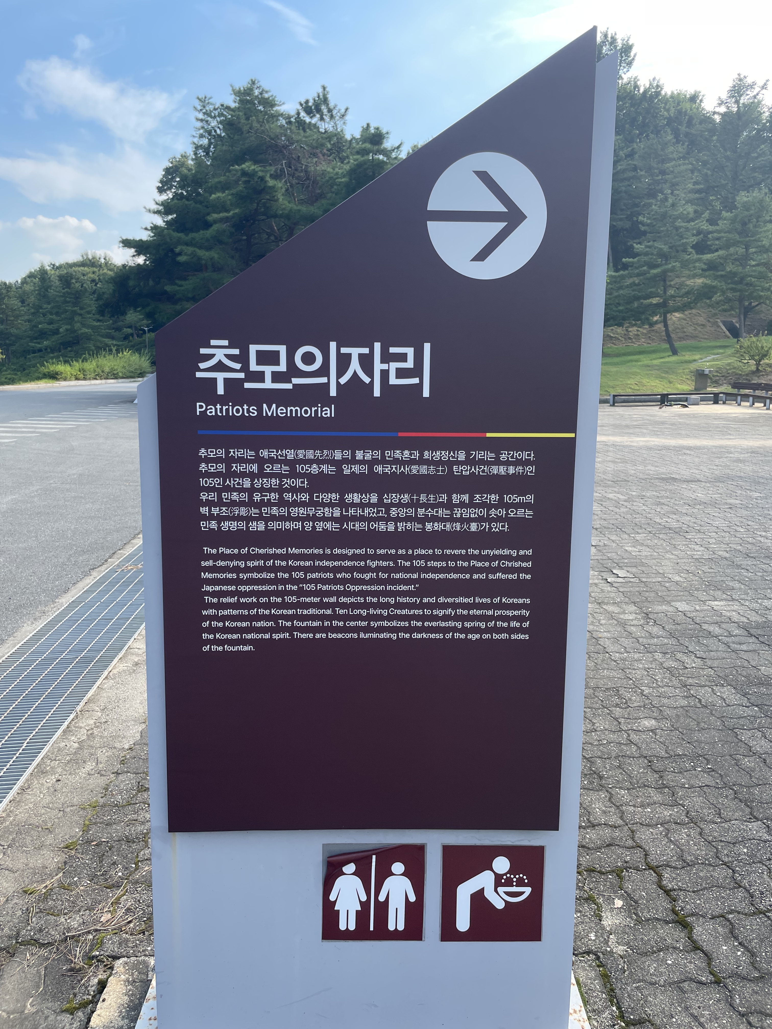 흑성산(흑성산성) 아래 넓은 대지의 독립기념관은 가운데 우뚝 선 겨레의 탑을 지나 초록의 기와를 얹은 겨레의 집, 그 뒤로 정식 7개관에 이르는 대단위 전시 기념물이다. 4전시관 오른쪽 뒤로 나가면 대리석 계단으로 이어지는 추모의자리라는 공간이 나온다. 추모의자리는 순국선열을 기리고 자랑스런 대한민국을 지켜가는 우리들이 의지를 다지는 공간이다. 그래서 높고 길게 뻗어 있는 105층계(105인 사건 상징) 계단을 오르면 그 옆으로 수많은 애국시어록비가 숲으로 이룬다. 그래선지 숙연해진다. 다다른 곳의 끝에는 석조 기념물로 만든 생명수를 상징하는 분수가 있다. 그 양옆 끝에 어둠을 밝히는 봉화가 있는데, 봉화는 어둠의 시대 일제의 무단통치를 끝내기 위해 각지에서 3.1만세시위를 알리는 수단이었다.