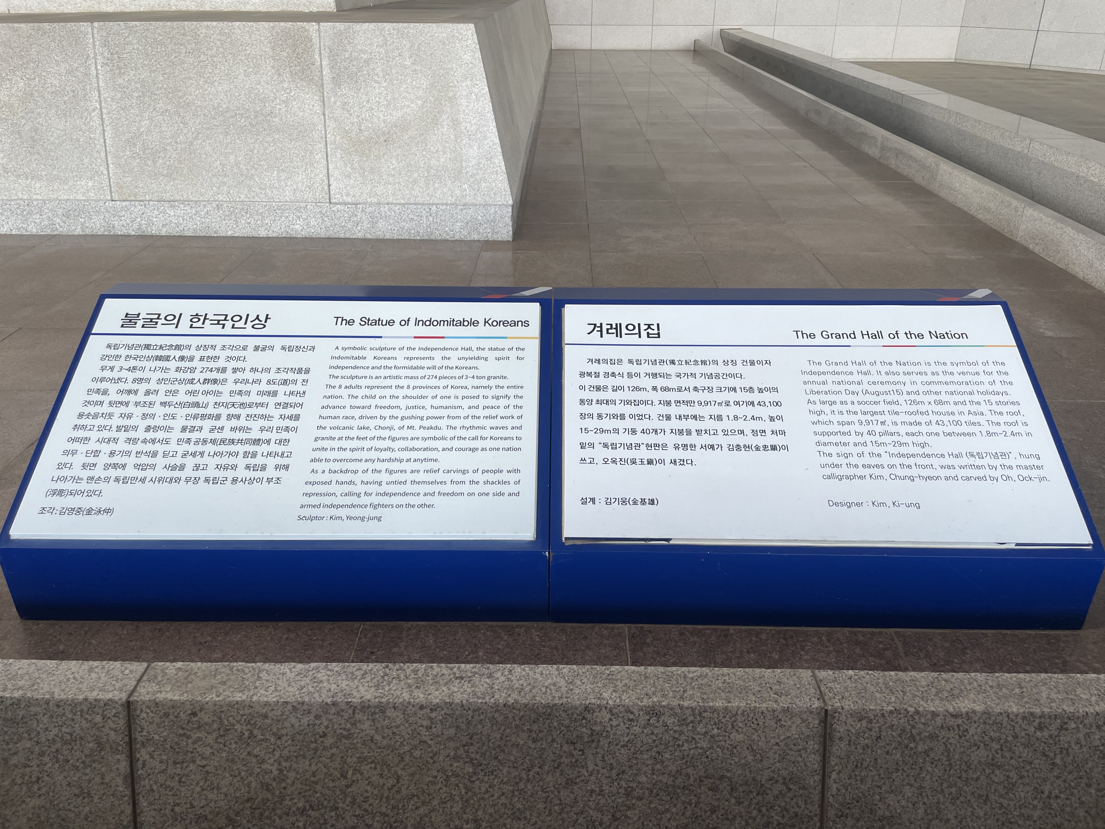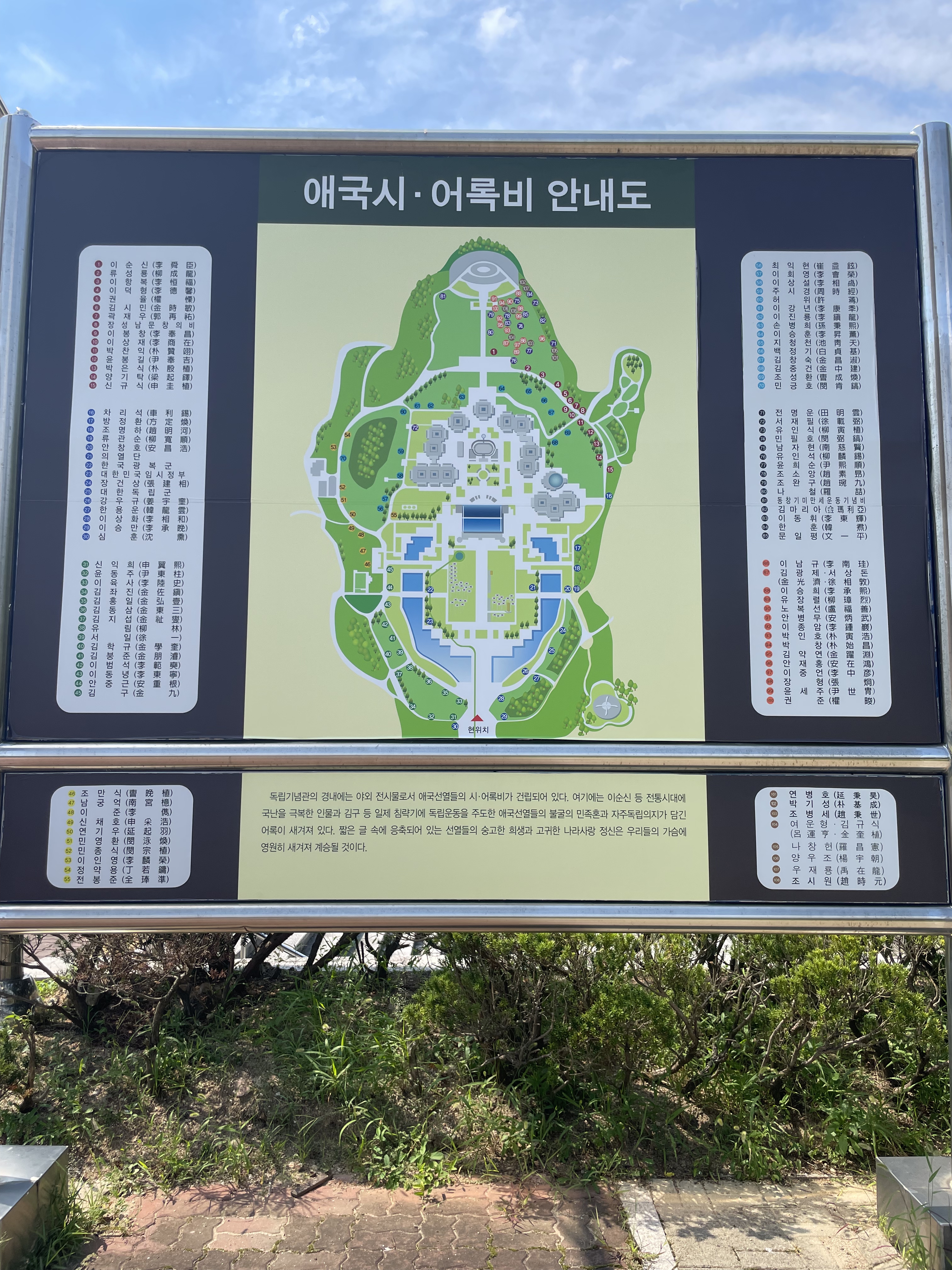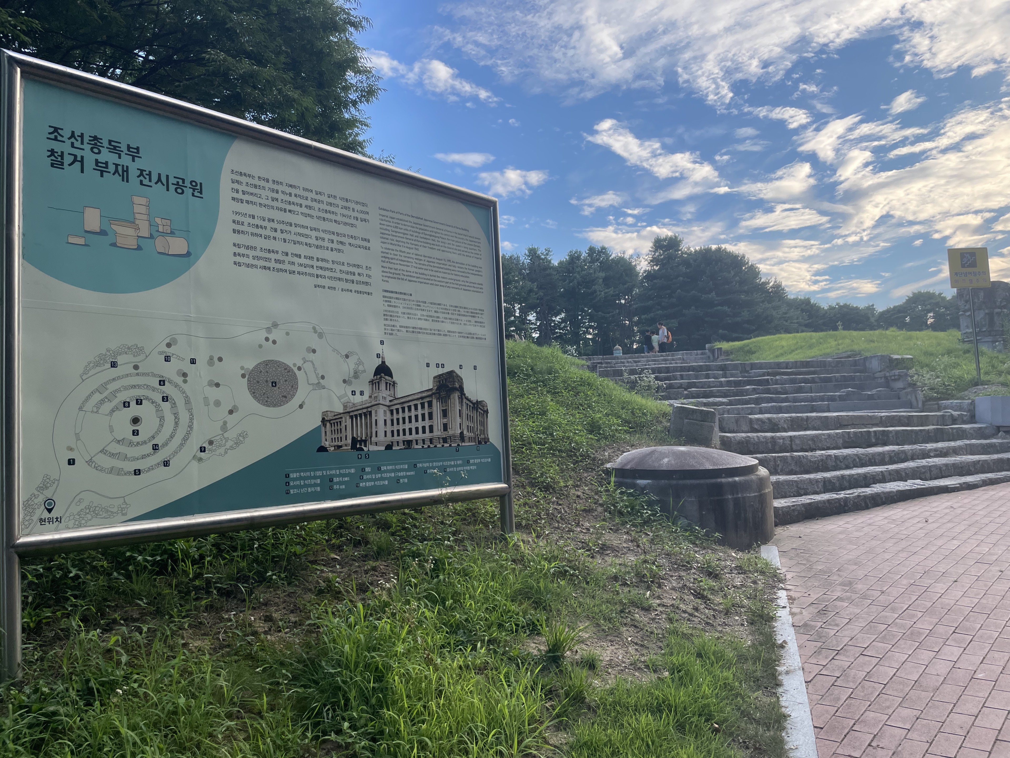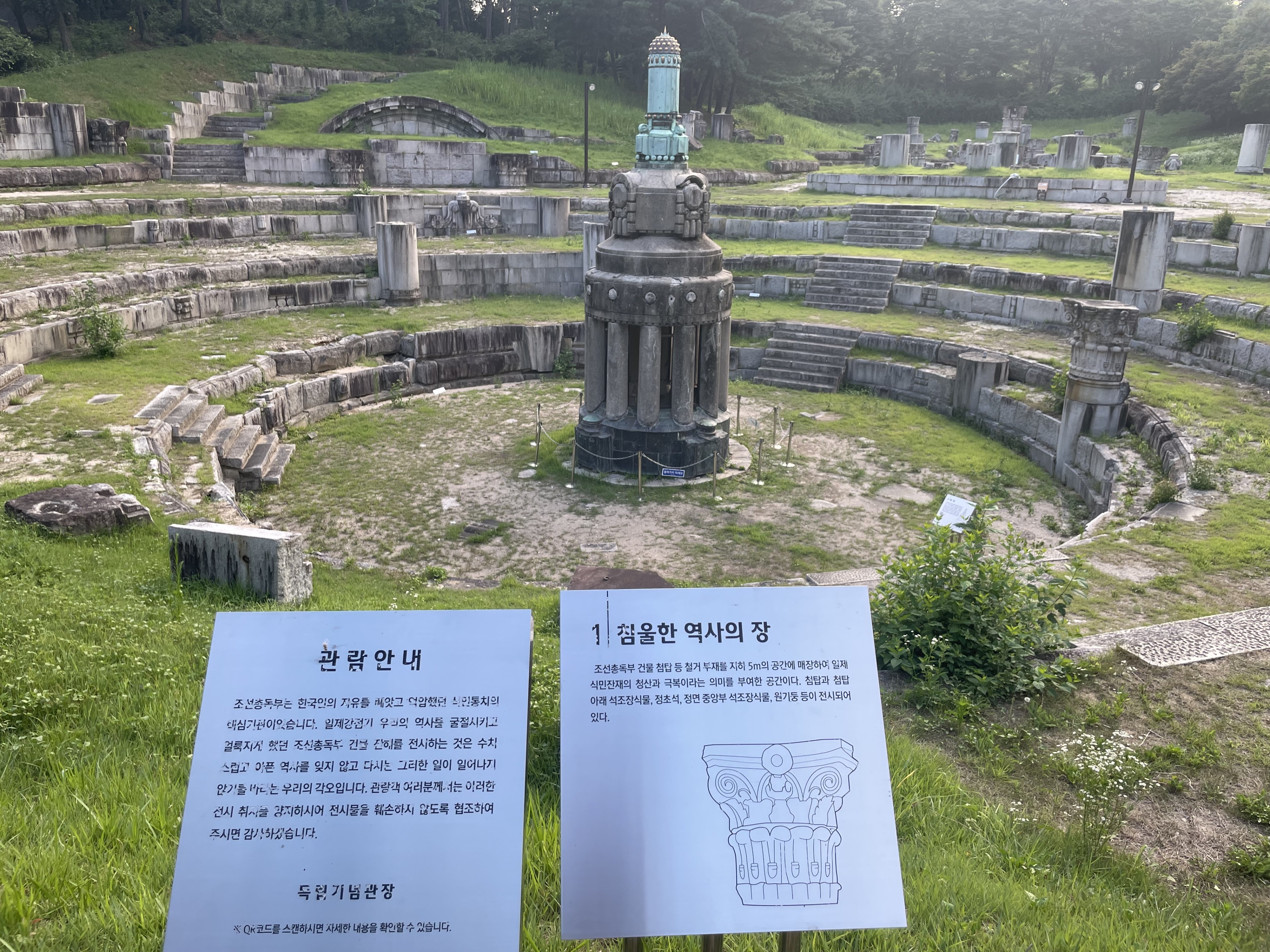 독립기념관은 많은 사람이 찾는 공간이나 그 뒤 추모의자리나 조선총독부 철거물 전시 공간을 찾는 이는 드물다. 사실 엄청나게 크고 많은 전시관을 보다보면 그럴 여유가 없을 테다. 그럼에도 불구하고 이러한 공간은 우리 독립기념관에 아주 중요한 공간이다. 특히 추모의자리는 국민 한사람 한사람이 정성을 모았던 지난 역사의 흔적이다. 폭염에 야외 공간을 다니는 건 쉽지 않다 지난 날 갑작스런 해방의 그날, 푹푹찌는 날씨자만 해방의 자유로 들뜬 열기도 대단했을 것이다. 그날 날씨가 문제랴