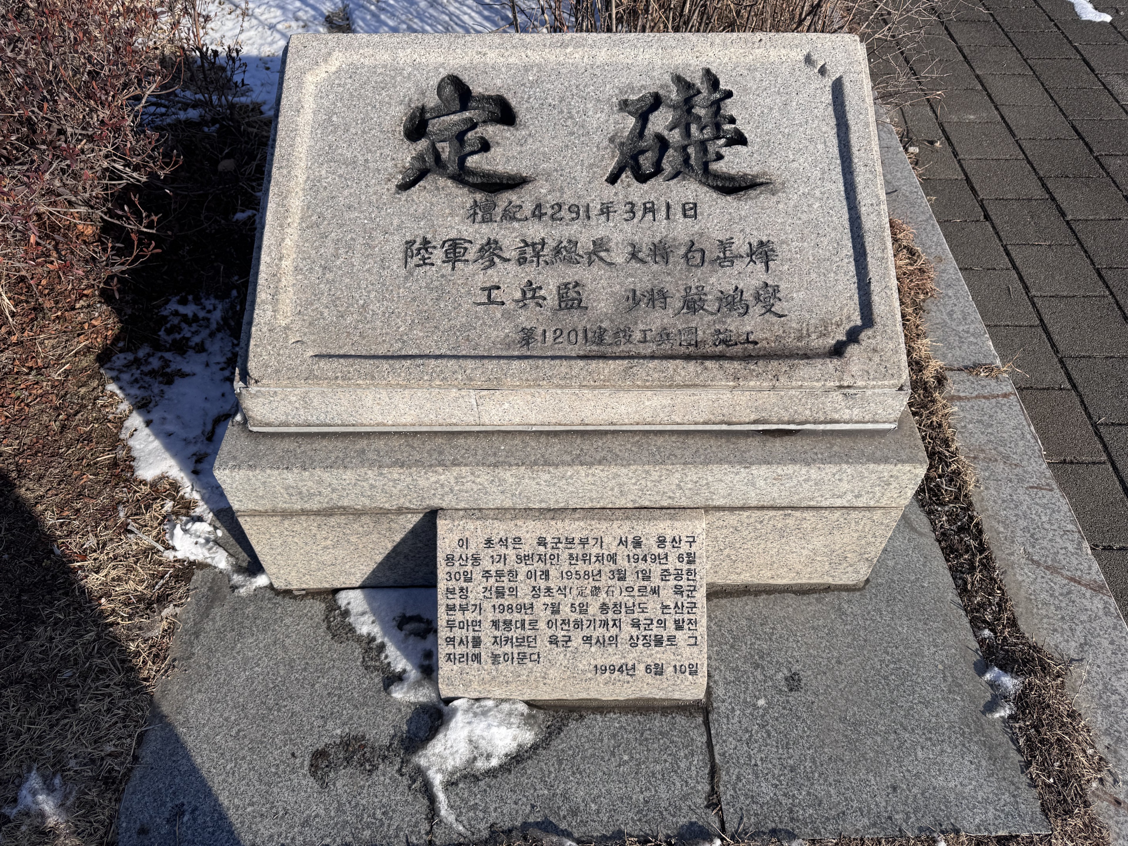 이 초석은 육군본부가 서울 용산구 용산동 1기 8번지인 현위치에 1949년 6월 30일 주둔한 이래 1958년 3월 1일 준공한 본청 건물의 정초석(定礎石)으로써 육군 본부가 1989년 7월 5일 충청남도 논산군 두마면 계룡대로 이전하기까지 육군의 발전 역사를 지켜보던 육군 역사의 상징물로 그 자리에 놓아둔다